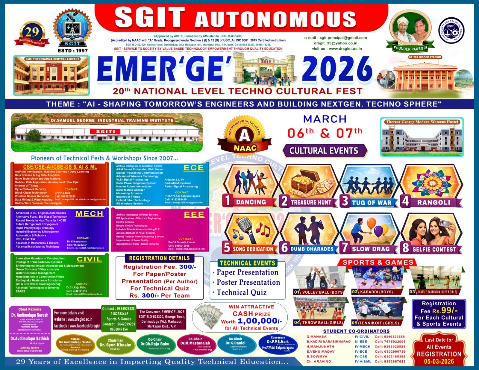 Dr. Samuel George Institute of Engineering and Technology (SGIT) was established in the year 1997 at Markapur, Prakasam Dist, Andhra Pradesh is the long awaited dream for Dr. Samuel George – founder of the college who is an educationalist, humanist and a visionary apart from being an academician who taught in various American Universities. His desire for imparting quality technical education combined together with the affection for his native place has resulted in establishment of this institute. The main objective of the Institute is to give best possible technical education with state of the art facilities.